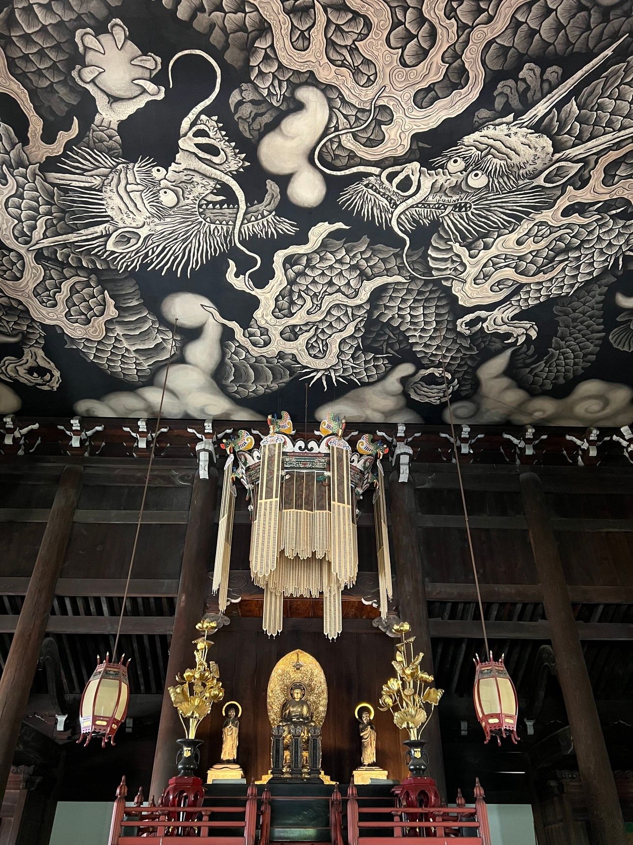 Surprisingly peaceful given its location in central Gion, Kennin-ji has artwork – old and new – which beats many museums. The collection includes very famous paintings, such as the gold screen with white and green gods of thunder and wind, and twin dragons writhing across the ceiling. But the lesser-known pieces are equally full of character.